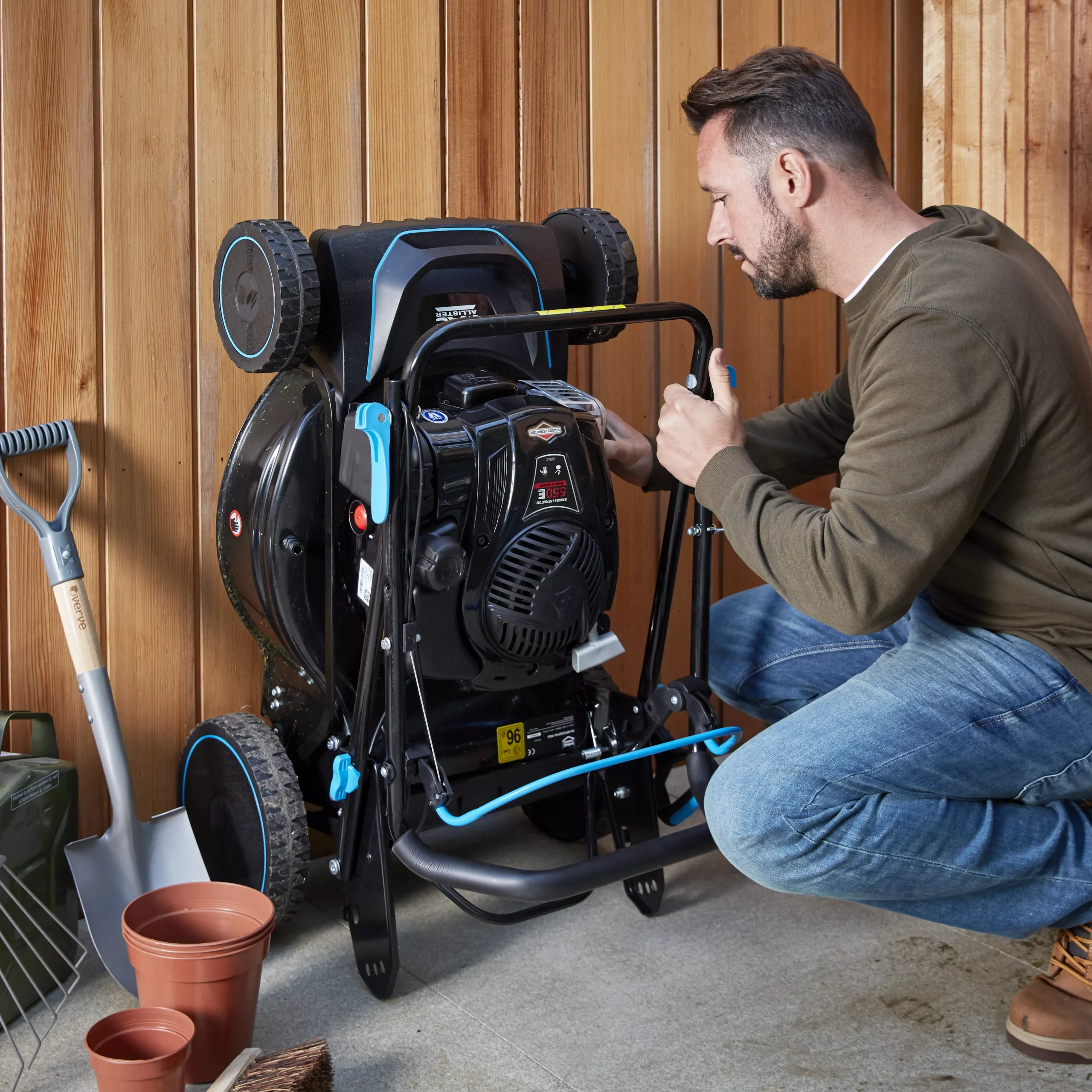 - Mow and stow functionality means mower can be stored vertically – it’s revolutionary in saving precious space, reducing your mower footprint by up to 70%. This function also allows for easier cleaning and maintenance underneath the deck