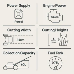 - Rugged powder coated and hard wearing steel chassis with 46cm cutting width