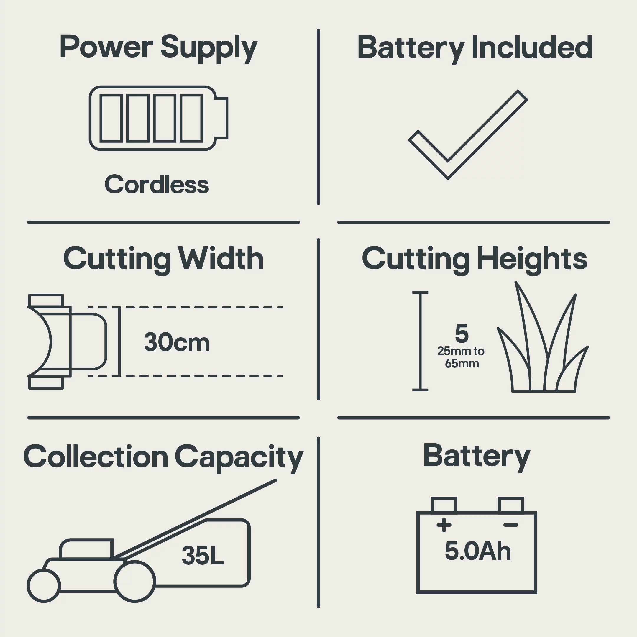 - Comes with 1 x 5.0Ah 18v battery, 1 x 2.0A 18V battery charger, 1 x mulching plug, 1 x 35L grass catcher