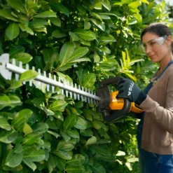 The STIGA HT 500e is a powerful 48V battery hedge trimmer that enables you to work free from messy cables and petrol fumes, for approximately 50 minutes on one charge, dependent on conditions. Its 58cm dual-action laser-cut blades cut through hedges and bushes with ease. The ergonomically shaped soft grip handle can rotate 180° into 3 positions making vertical and horizontal cutting more comfortable. The intuitive keypad makes operation easy, while handle and rear trigger safety switches protect you whilst working. The built-in blade tip protection prevents damage to walls and paths and the blade also has a handy hanging hole for storage. The recommended 2Ah battery and charger are both available separately.